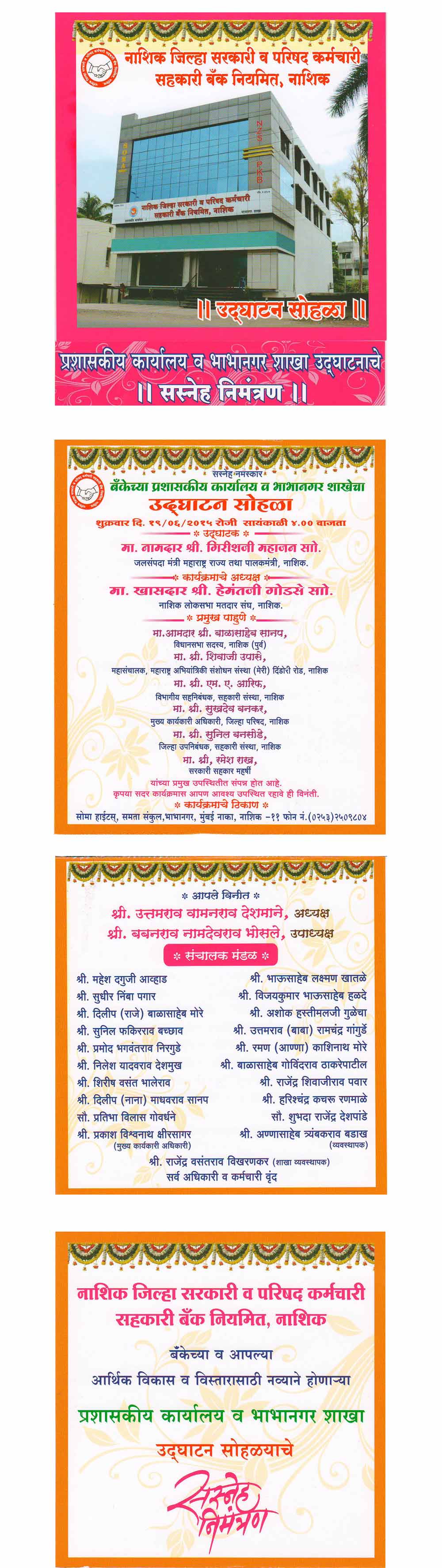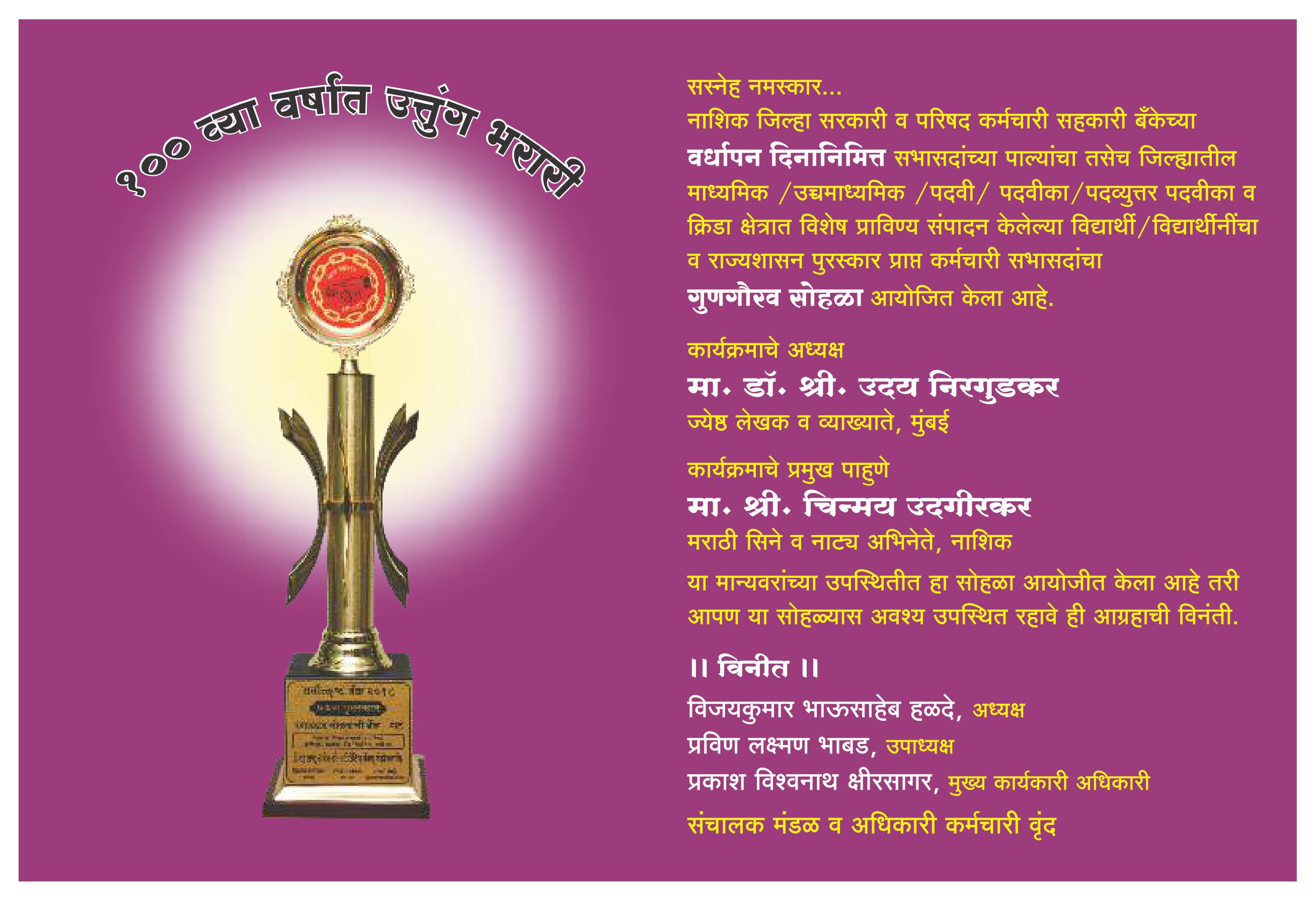 बँकेच्या वर्धापन दिनानिमित आयोजित गुणगौरव कार्यक्रम शुक्रवार दि. २२ सप्टेंबर २०१७ रोजी परशुराम सायखेडकर (प.सा.) नाट्यगृह ,नेहरू गार्डन, टिळकपथ, नाशिक येथे सायंकाळी ५.३० वाजता मान्यवरांच्या शुभहस्ते आयोजित केला आहे. तरी कुपया याची नोंद घ्यावी व आपल्या गुणवंत पाल्याचे गुणपत्रक विहीत नमुन्यातील अर्जासोबत दि.१५ सप्टेंबर २०१७ पर्यंत बँकेच्या कार्यालयीन वेळेत जमा करावेत. विहीत नमुन्यातील अर्जाचे वाटप सर्व शाखांत चालू आहे.