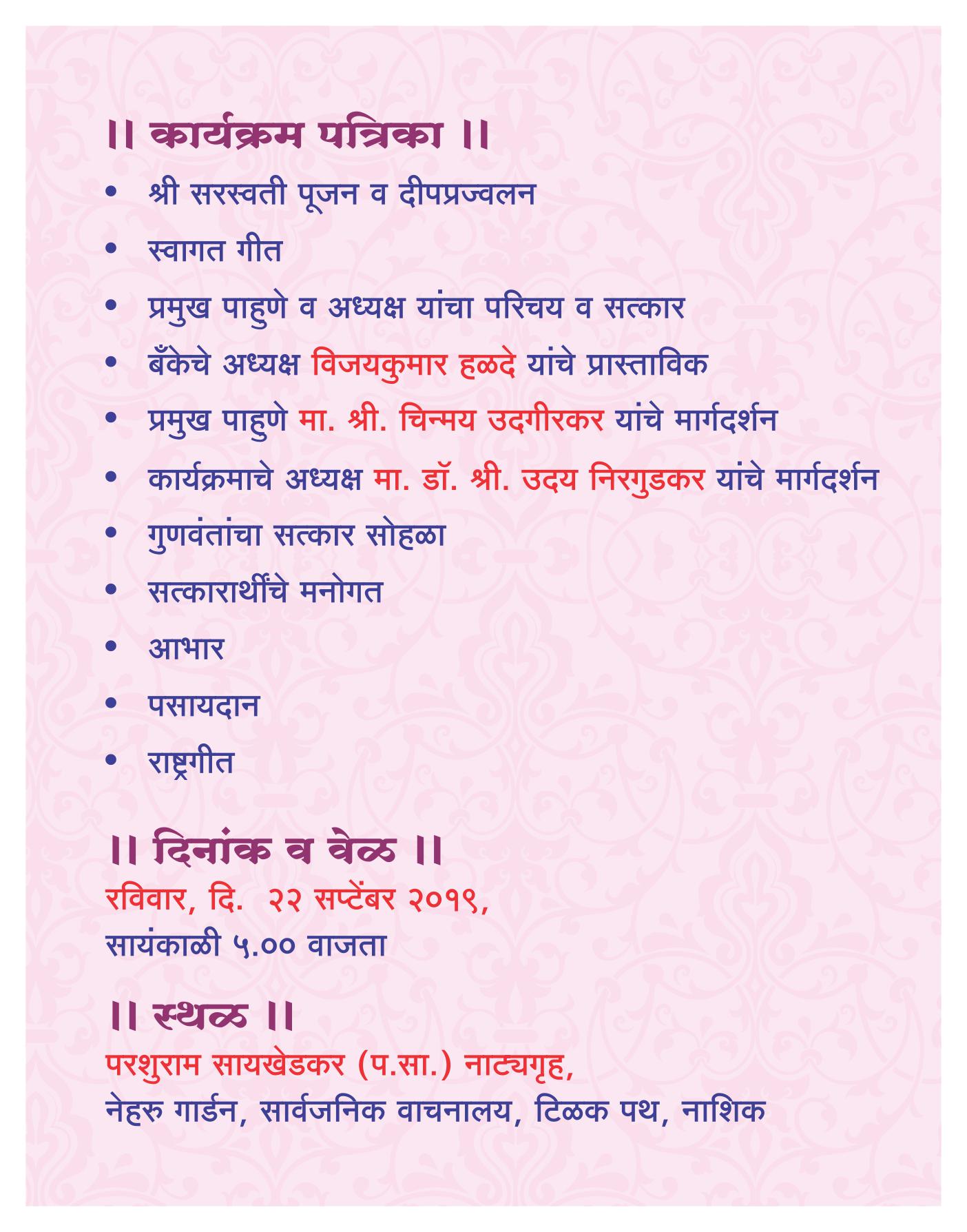 दि. १०/०८/२०१९ रोजी सकाळी ठीक ११.०० वाजता परशुराम सायखेडकर (प.सा.) नाट्यगृह सार्वजनिक वाचनालय,नेहरू गार्डन, टिळकपथ, नाशिक येथे