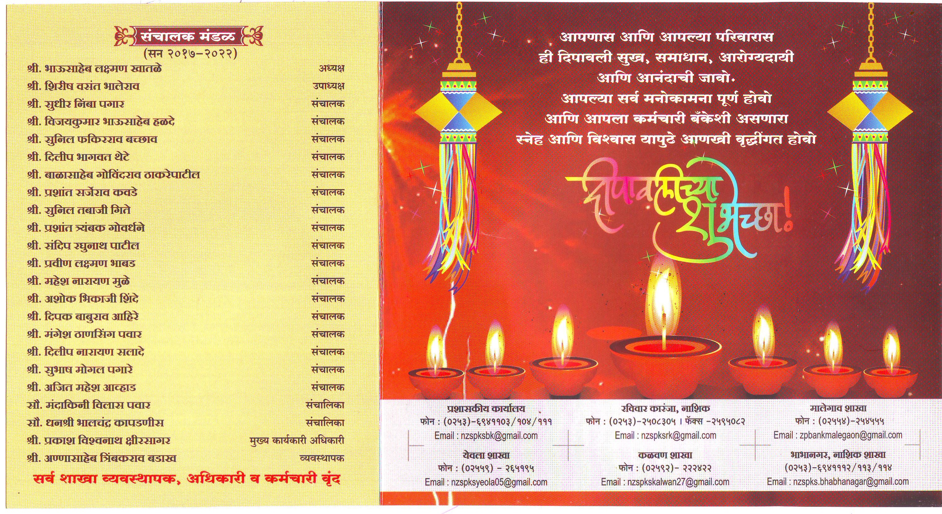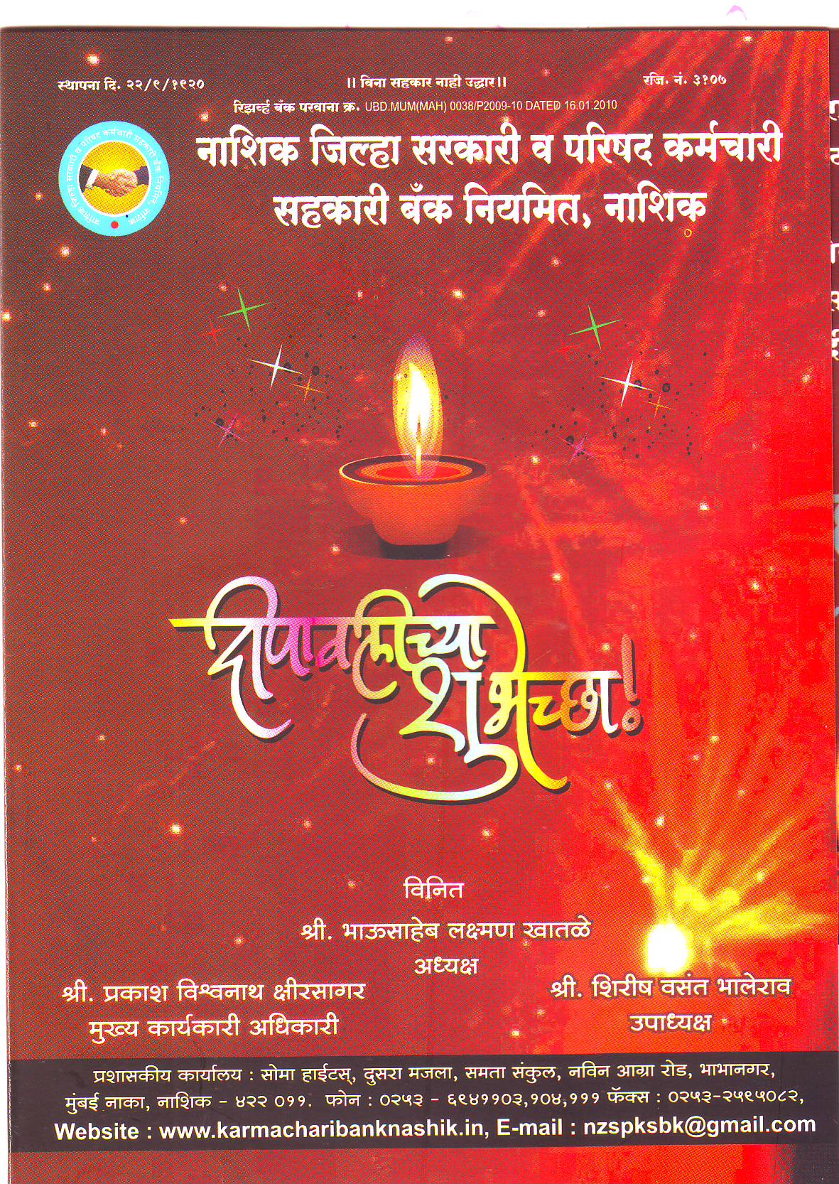 बँकेच्या सर्व सन्मानीय सभासद ,ठेवीदार, खातेदार व हितचिंतकास ही दिपावली व नुतन वर्ष आनंद ,सुख समाधानी व आरोग्यदायी जावो हीच नाशिक जिल्हा सरकारी व परिषद कर्मचारी सहकारी बँकेतर्फे मनपुर्वक हार्दिक शुभेच्छा