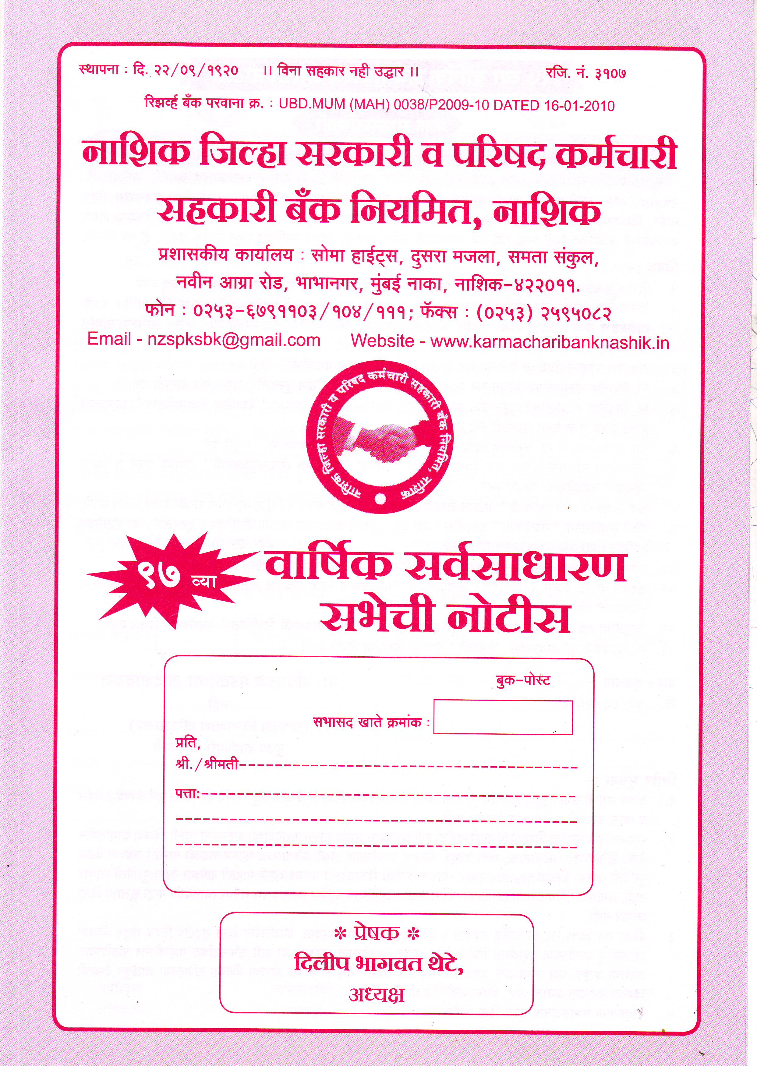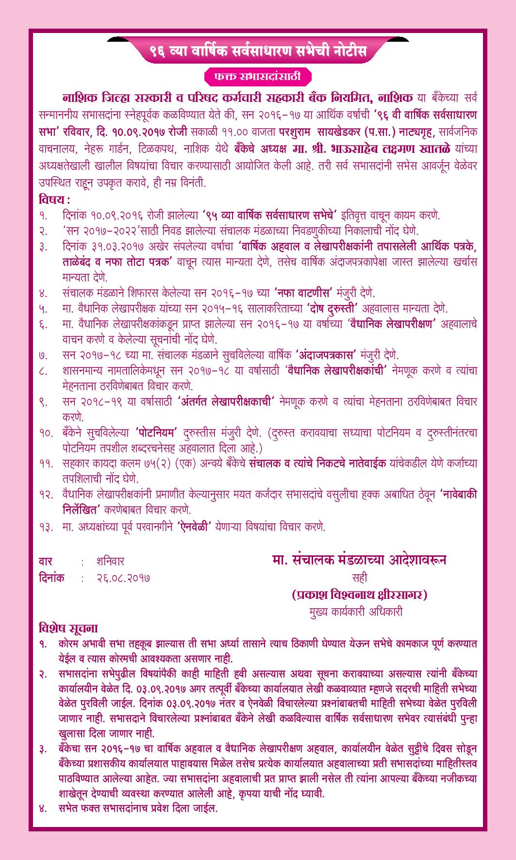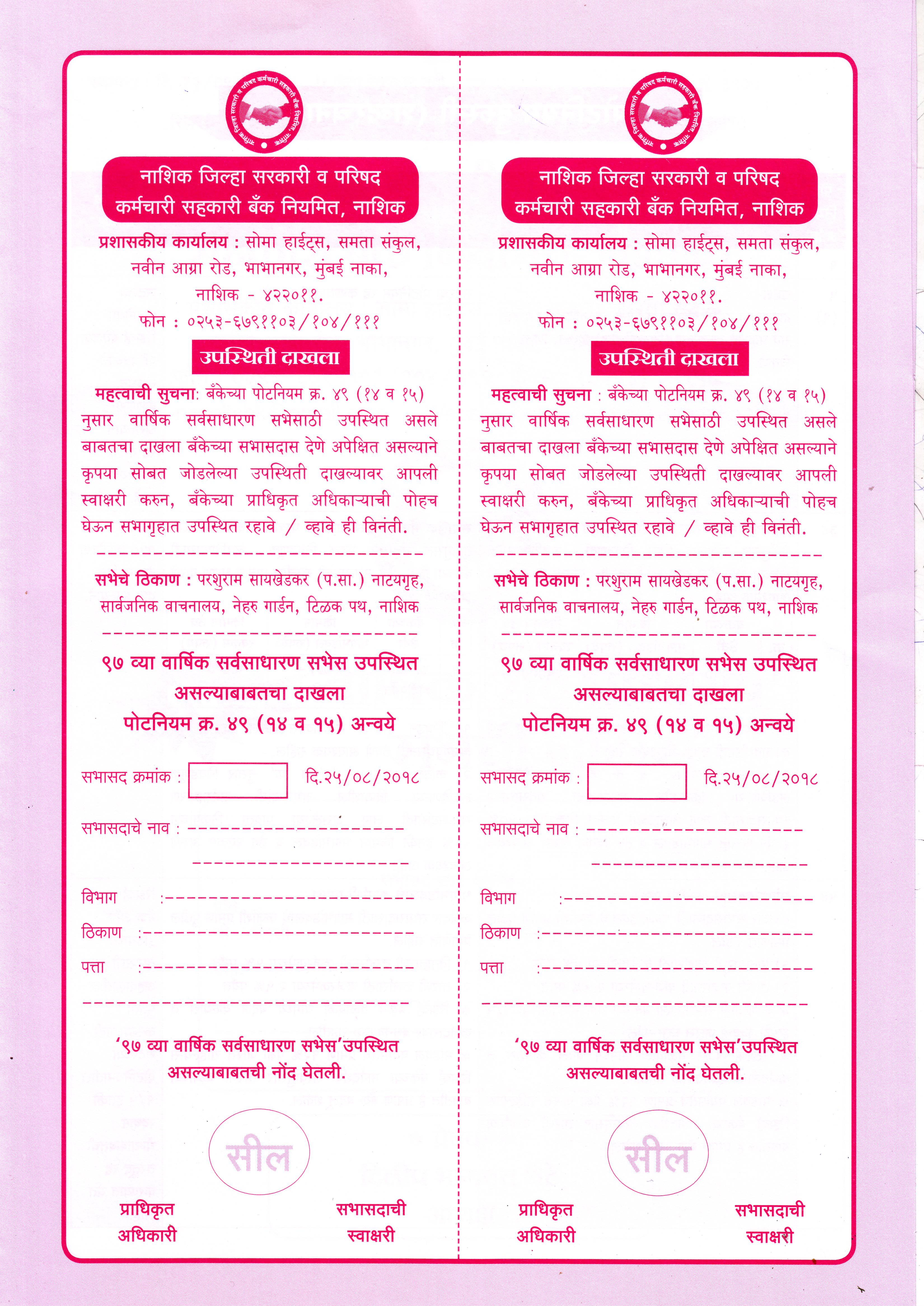 नाशिक जिल्हा सरकारी व परिषद कर्मचारी सहकारी बँक नियमित, नाशिक या बँकेच्या सर्व सन्माननीय सभासदांना स्नेहपुर्वक कळविण्यात येते की, सन २०२४-२५ आर्थिक वर्षाची " १०५ वी वार्षिक सर्वसाधारण सभा " रविवार दिनांक २२/०६/२०२५ रोजी सकाळी ११.०० वाजता "परशुराम सायखेडकर (प.सा.) नाट्यगृह", सार्वजनिक वाचनालय,नेहरू गार्डन, टिळकपथ,नाशिक येथे बँकेचे अध्यक्ष मा. श्री. रविंद्र शिवनाथ आंधळे यांच्या अध्यक्षतेखाली आयोजित करण्यात आली आहे.तरी सर्व सभासदांनी सभेत आवर्जून वेळेवर उपस्थित राहून उपकृत करावे ही नम्र विनंती .सोबत सभेची नोटीस दिली आहे.