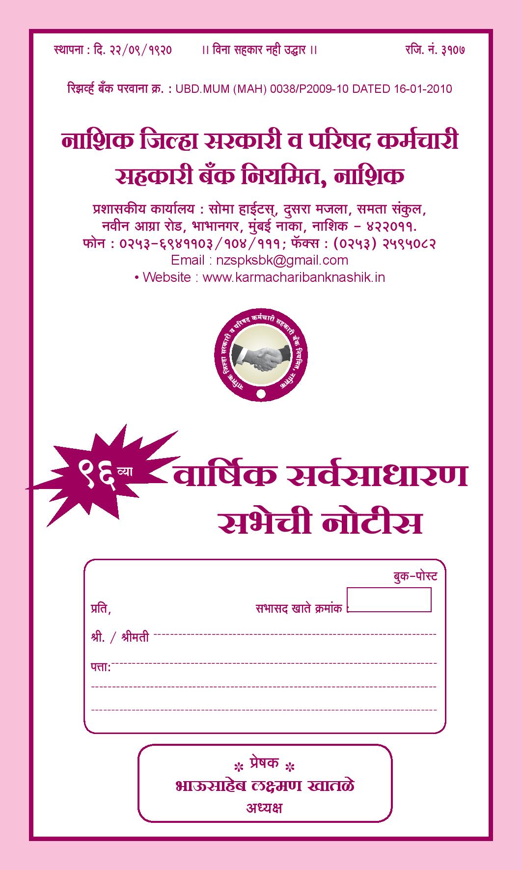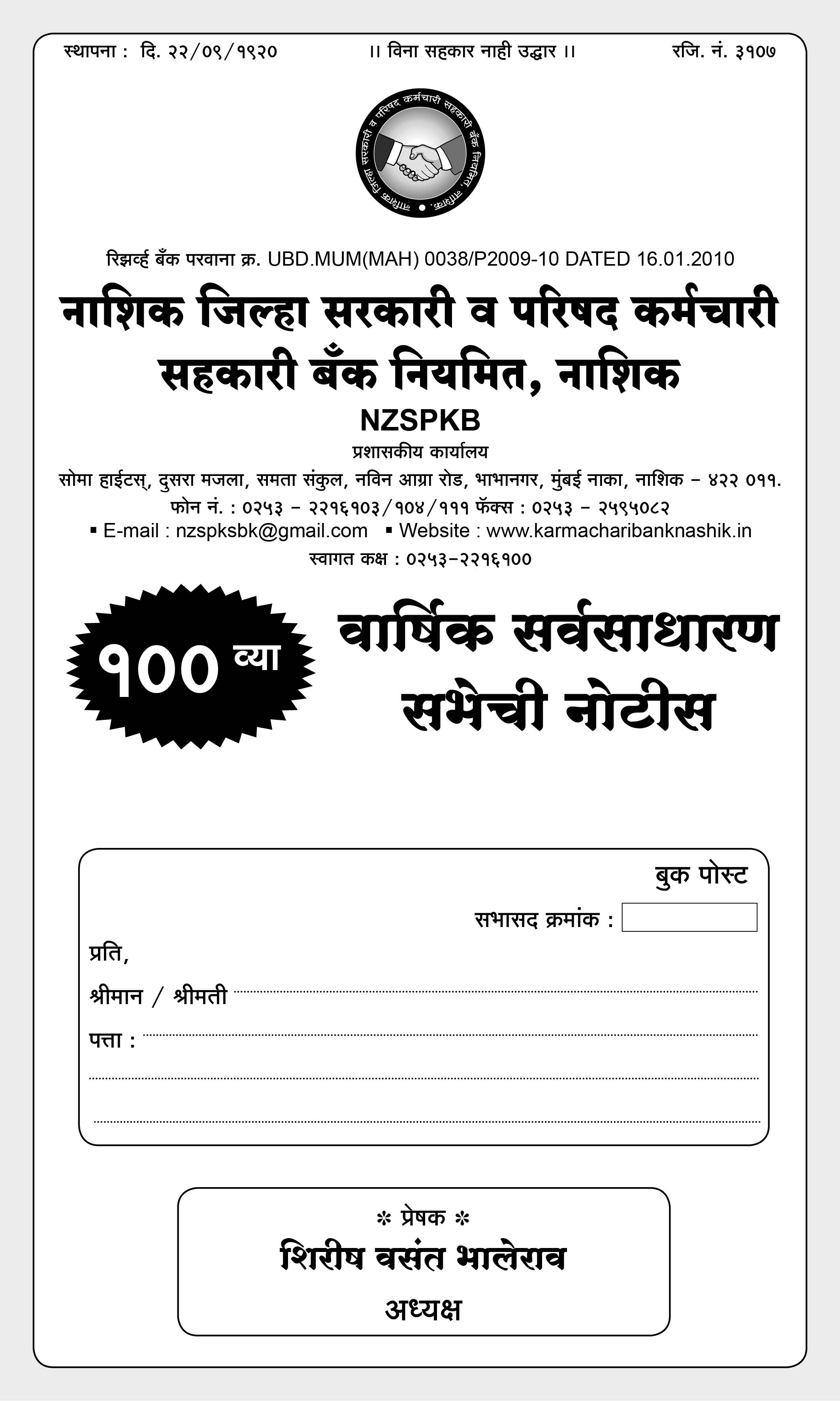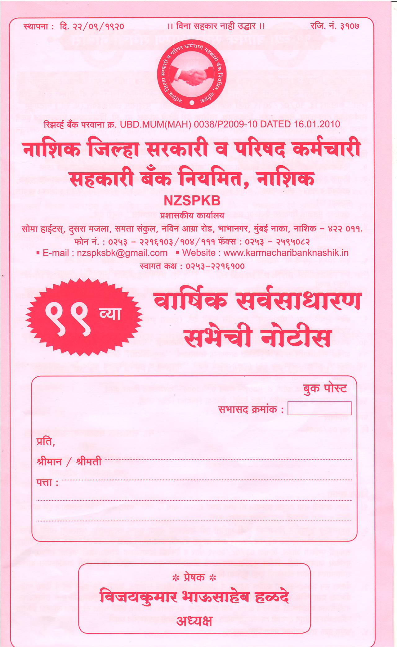 नाशिक जिल्हा सरकारी व परिषद कर्मचारी सहकारी बँक नियमित, नाशिक या बँकेच्या सर्व सन्माननीय सभासदांना स्नेहपुर्वक कळविण्यात येते की, सन २०२४-२५ आर्थिक वर्षाची " १०५ वी वार्षिक सर्वसाधारण सभा " रविवार दिनांक २२/०६/२०२५ रोजी सकाळी ११.०० वाजता "परशुराम सायखेडकर (प.सा.) नाट्यगृह", सार्वजनिक वाचनालय,नेहरू गार्डन, टिळकपथ,नाशिक येथे बँकेचे अध्यक्ष मा. श्री. रविंद्र शिवनाथ आंधळे यांच्या अध्यक्षतेखाली आयोजित करण्यात आली आहे.तरी सर्व सभासदांनी सभेत आवर्जून वेळेवर उपस्थित राहून उपकृत करावे ही नम्र विनंती .सोबत सभेची नोटीस दिली आहे.