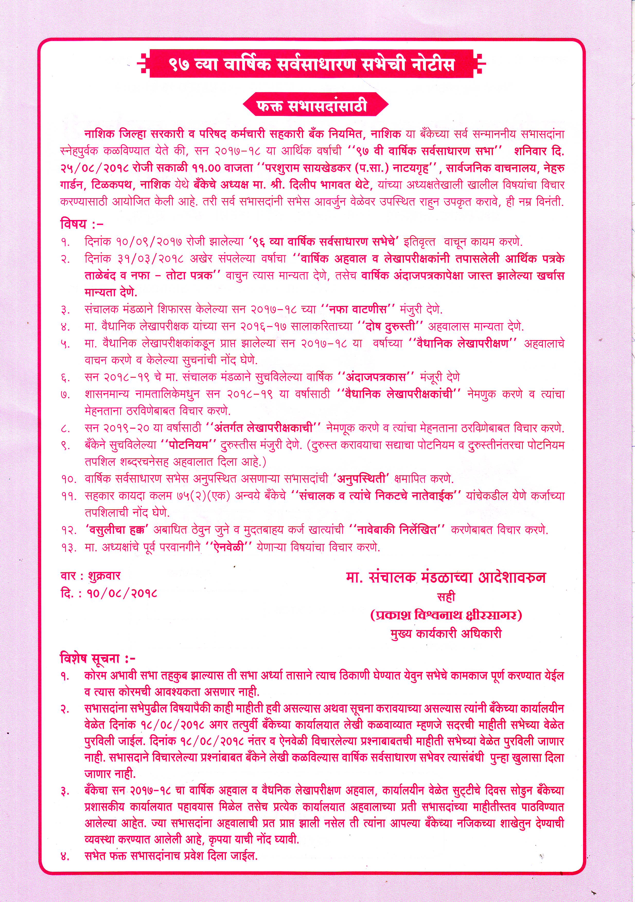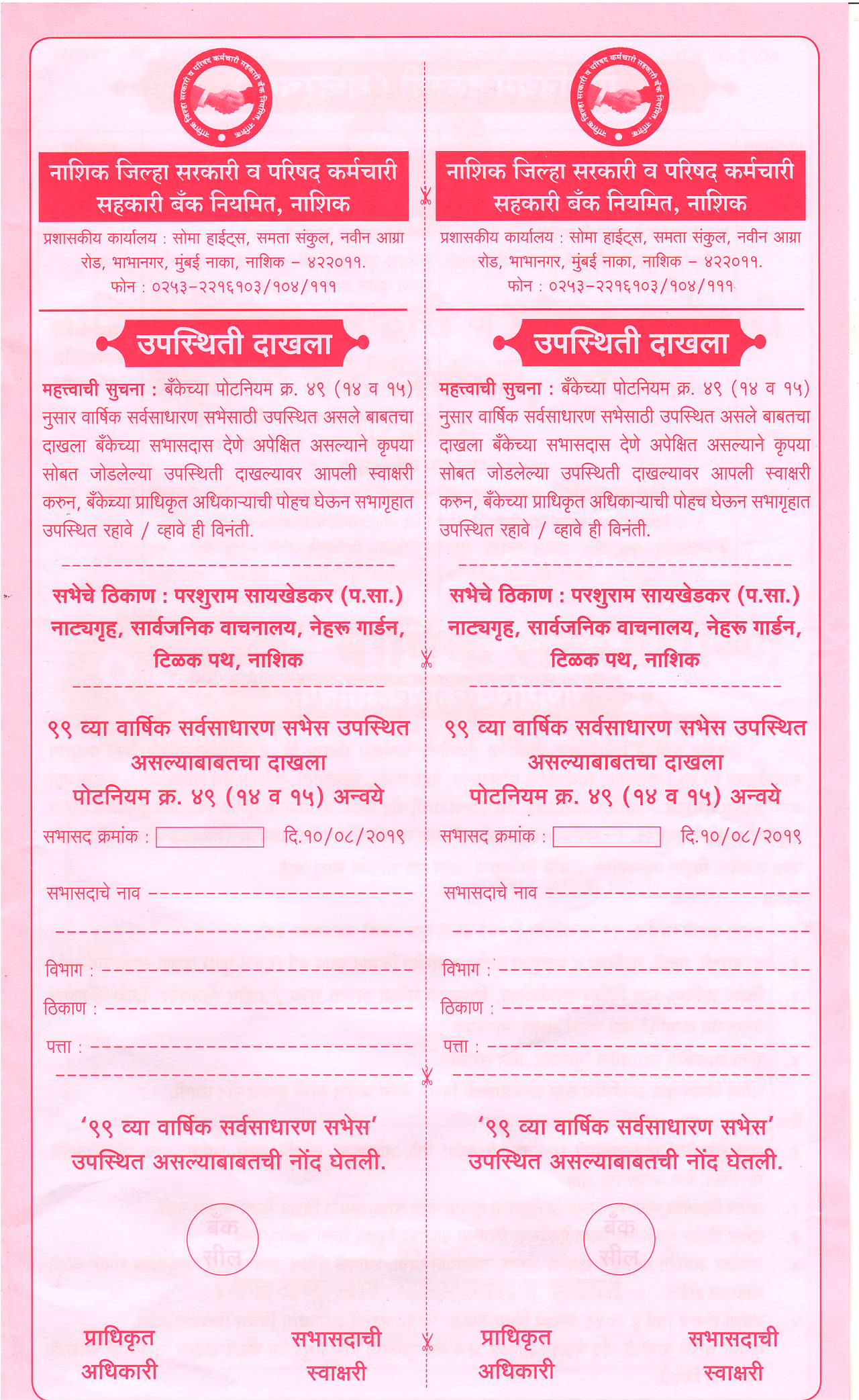 नाशिक जिल्हा सरकारी व परिषद कर्मचारी सहकारी बँक नियमित, नाशिक या बँकेच्या सर्व सन्माननीय सभासदांना स्नेहपुर्वक कळविण्यात येते की, सन २०२३-२४ आर्थिक वर्षाची " १०४ वी वार्षिक सर्वसाधारण सभा " रविवार दिनांक ०७/०७/२०२४ रोजी सकाळी ११.०० वाजता "परशुराम सायखेडकर (प.सा.) नाट्यगृह", सार्वजनिक वाचनालय,नेहरू गार्डन, टिळकपथ,नाशिक येथे बँकेचे अध्यक्ष मा. श्री.बाळासाहेब गोविंदराव ठाकरेपाटील यांच्या अध्यक्षतेखाली आयोजित करण्यात आली आहे.तरी सर्व सभासदांनी सभेत आवर्जून वेळेवर उपस्थित राहून उपकृत करावे ही नम्र विनंती .सोबत सभेची नोटीस दिली आहे.