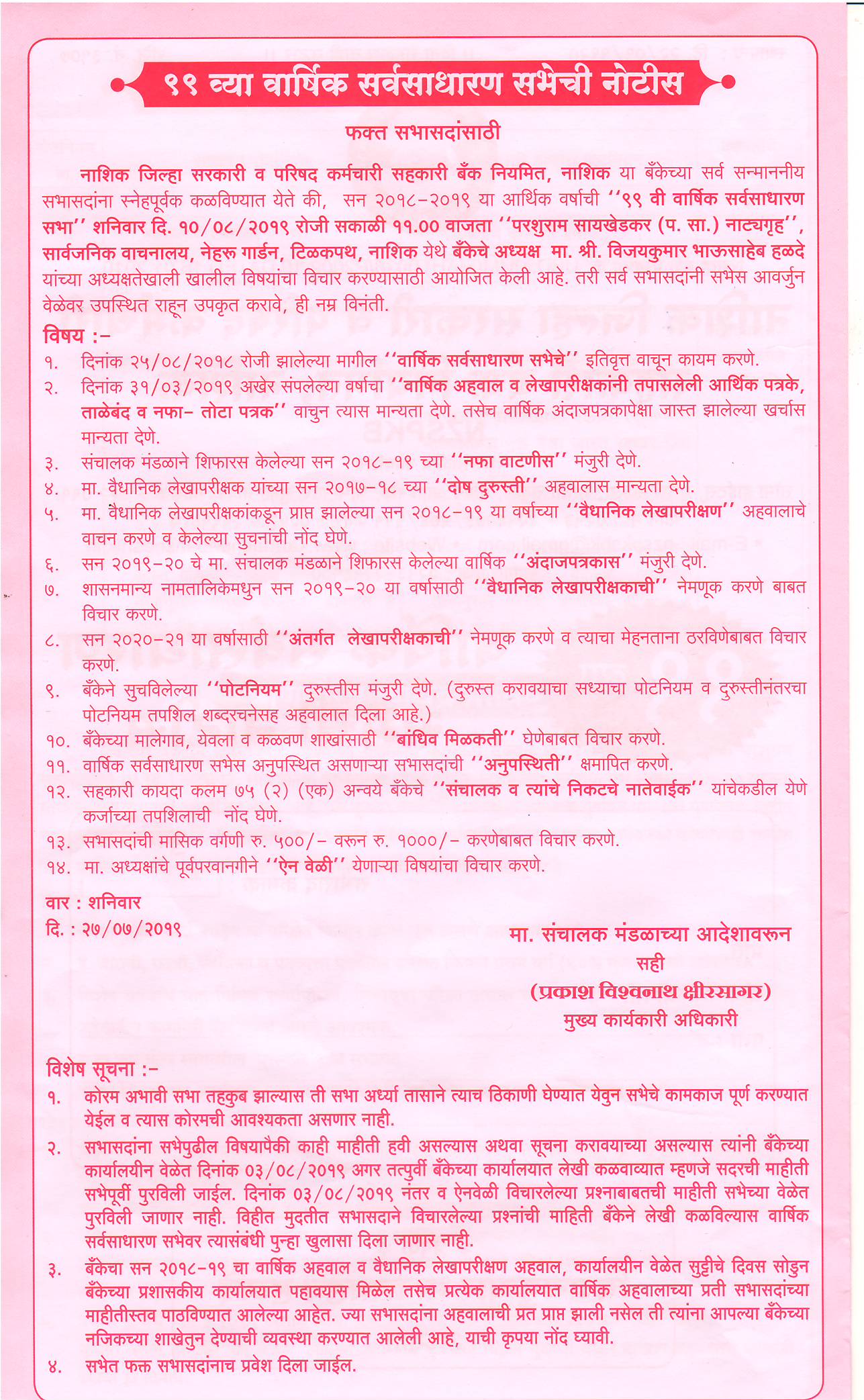 बँकेच्या सर्व सन्माननीय सभासदांना स्नेहपुर्वक कळविण्यात येते की, सन २०१८-१९ या आर्थिक वर्षाची " ९९ वी वार्षिक सर्वसाधारण सभा " शनिवार