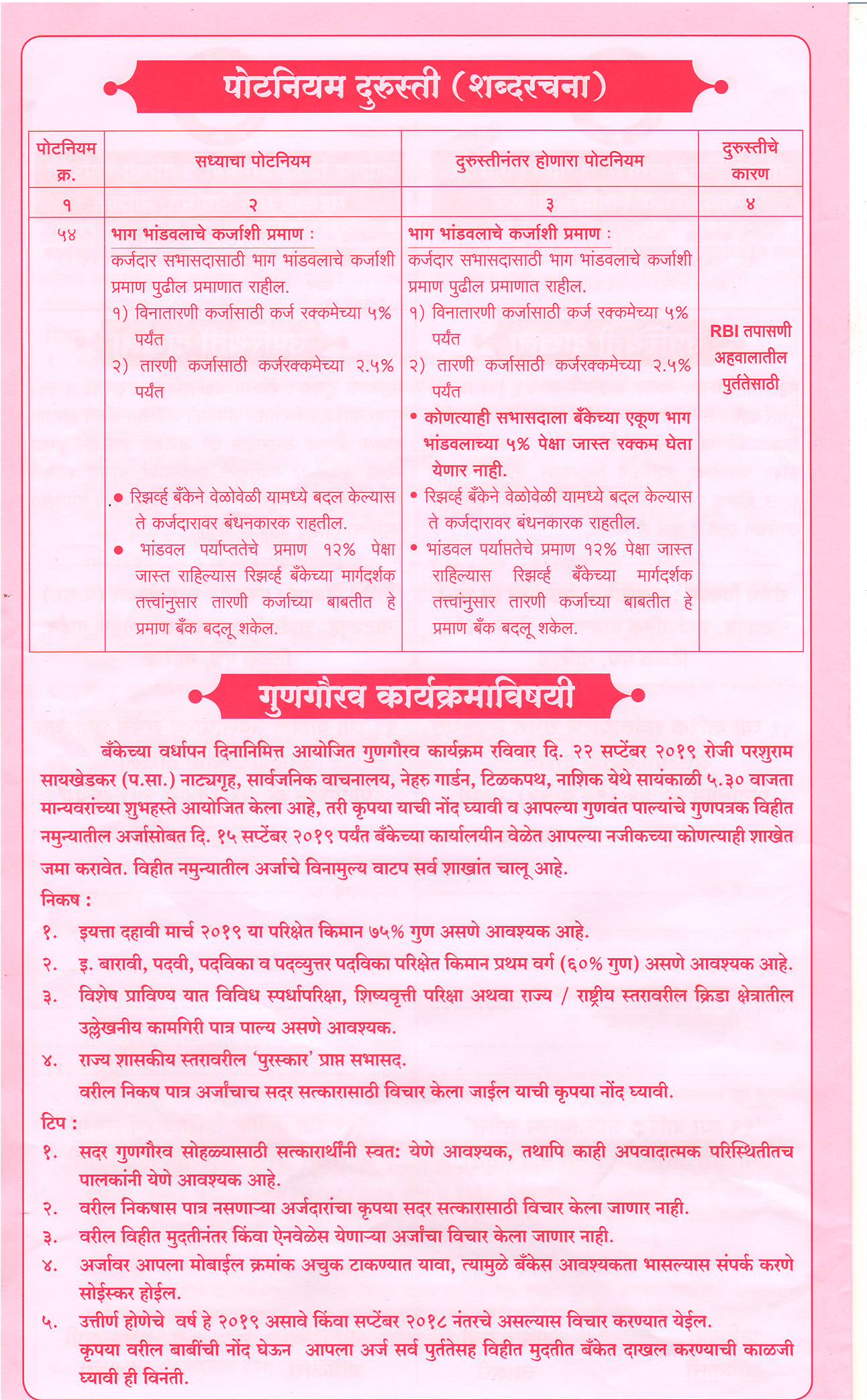 बँकेच्या वर्धापन दिनानिमित आयोजित गुणगौरव कार्यक्रम रविवार दि. २२ सप्टेंबर २०१९ रोजी परशुराम सायखेडकर (प.सा.) नाट्यगृह ,सार्वजनिक वाचनालय,नेहरू गार्डन, टिळकपथ, नाशिक येथे सायंकाळी ठिक ०५.३० वाजता मान्यवरांच्या शुभहस्ते आयोजित केला आहे. तरी कुपया याची नोंद घ्यावी व आपल्या गुणवंत पाल्याचे गुणपत्रक विहीत नमुन्यातील अर्जासोबत दि.१५ सप्टेंबर २०१९ पर्यंत बँकेच्या कार्यालयीन वेळेत जमा करावेत. विहीत नमुन्यातील अर्जाचे वाटप सर्व शाखांत चालू आहे.