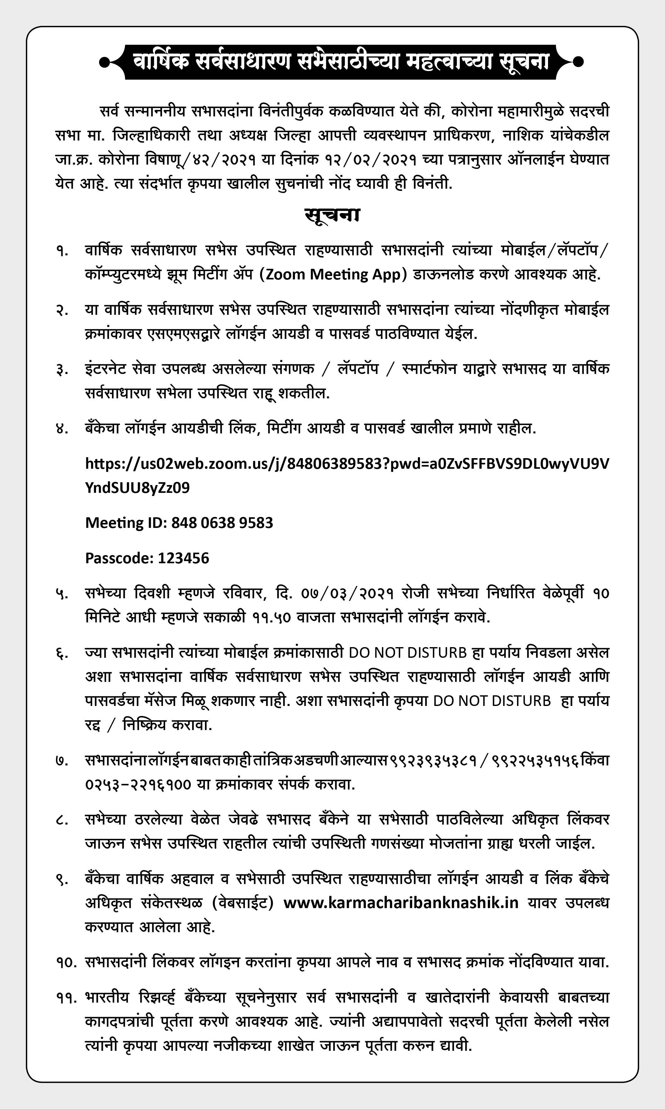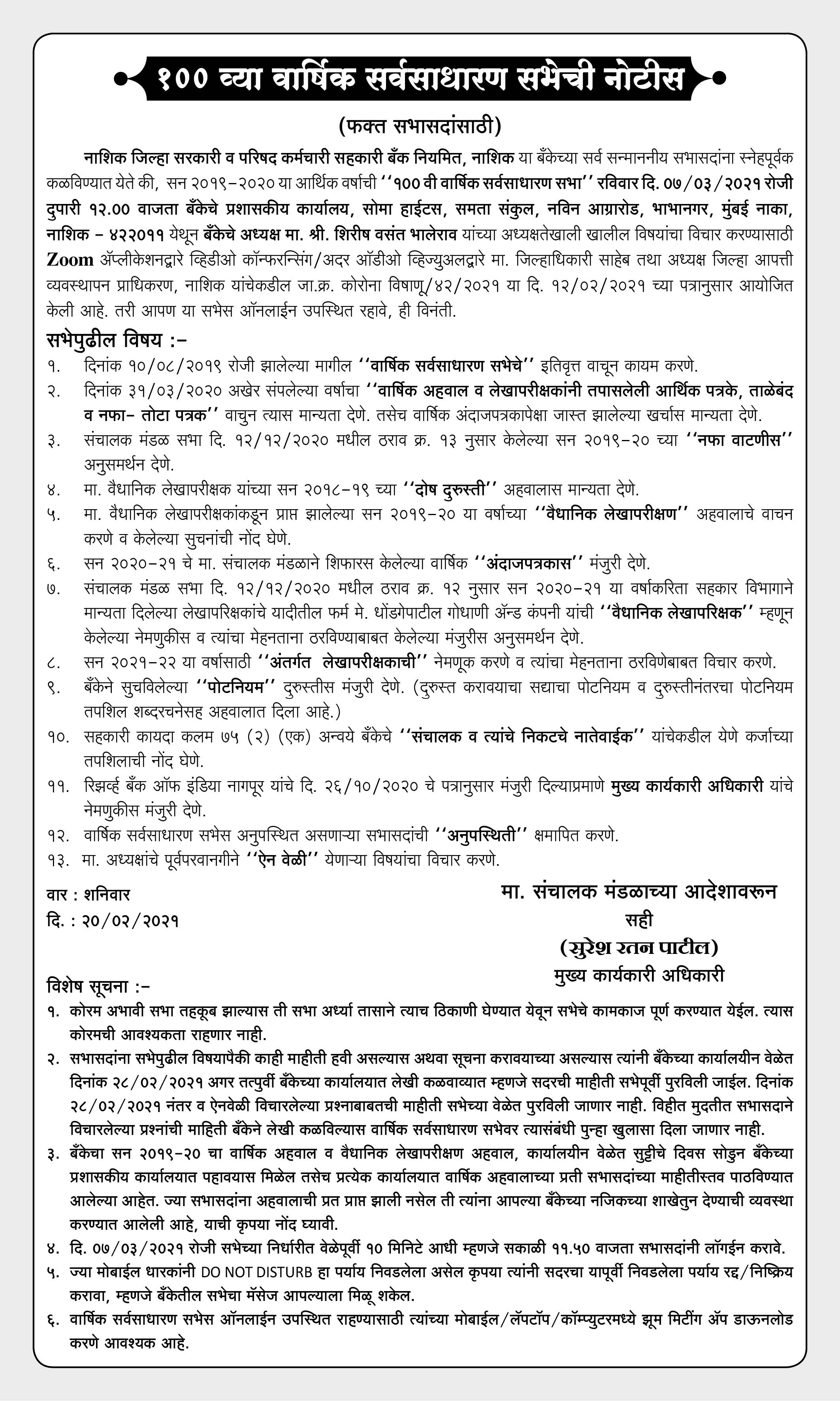 नाशिक जिल्हा सरकारी व परिषद कर्मचारी सहकारी बँक नियमित, नाशिक या बँकेच्या सर्व सन्माननीय सभासदांना स्नेहपुर्वक कळविण्यात येते की ,सन २०२०-२१ आर्थिक वर्षाची "१०१ वी वार्षिक सर्वसाधारण सभा" शनिवार दिनांक २५/०९/२०२१ रोजी सकाळी ११.०० वाजता परशुराम सायखेडकर (प.सा.) नाट्यगृह सार्वजनिक वाचनालय,नेहरू गार्डन, टिळकपथ, नाशिक येथे बँकेचे अध्यक्ष मा. श्री. शिरीष वसंत भालेराव यांच्या अध्यक्षतेखाली खालील विषयांचा विचार करण्यासाठी Zoom अँप्लिकेशनद्वारे ,व्हिडिओ कॉन्फरन्सिंग/अदर ऑडिओ व्हिज्युअलद्वारे महाराष्ट्र शासन, सहकार पणन विभाग यांचेकडील परिपत्रक क्रमांक : संकीर्ण -२०२१ /प्र.क्र.२४/१३ - स,दि. ३०/०७/२०२१ च्या नुसार आयोजित केली आहे तरी आपण या सभेस ऑनलाईन उपस्थित राहावे ही विनंती.